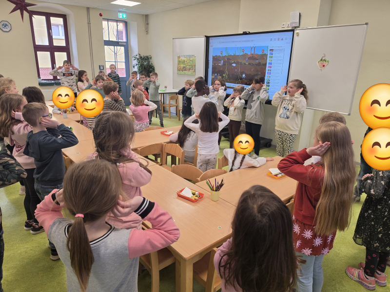 Mit diesem fröhlichen Lied startete unser gemeinsames Regenwurmprojekt der Klassen 1 und 2 zusammen mit den zukünftigen Einschülerinnen und Einschülern aus der Kita „Gänseblümchen“ in Alsleben und Plötzkau sowie dem Kinderland.