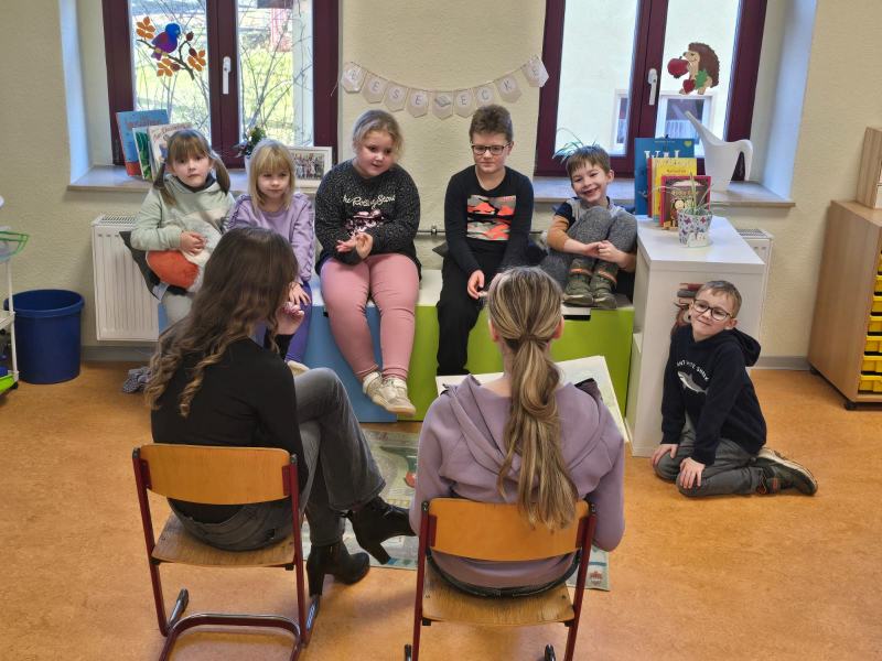 Am 21.11.2025 fand der bundesweite Vorlesetag statt. Zu diesem Anlass besuchten sechs Schülerinnen und Schüler der 7. Klasse der Freien Sekundarschule Alsleben die 1. Klasse unserer Grundschule. In kleinen Gruppen lasen die „Großen“ den „Kleinen“ spannende und lustige Geschichten vor.